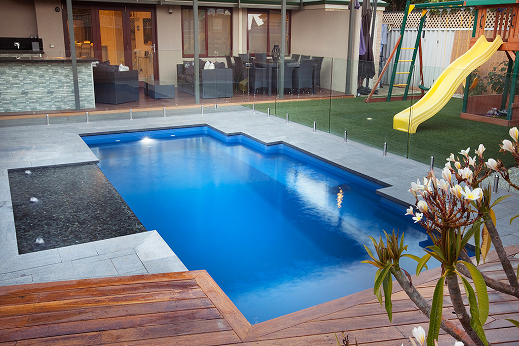 Clean functional lines of our Monaco swimming pool come to life with the installation of light coloured tile surrounds, contrasts of timber decking or lush grass landscaping. Glass fencing further compliments this swimming pool design. As with all Barrier Reef Pool designs, the Monaco range incorporates the safety step ledge for junior swimmers, non-slip steps, smooth edges and vibrant shimmer colours.